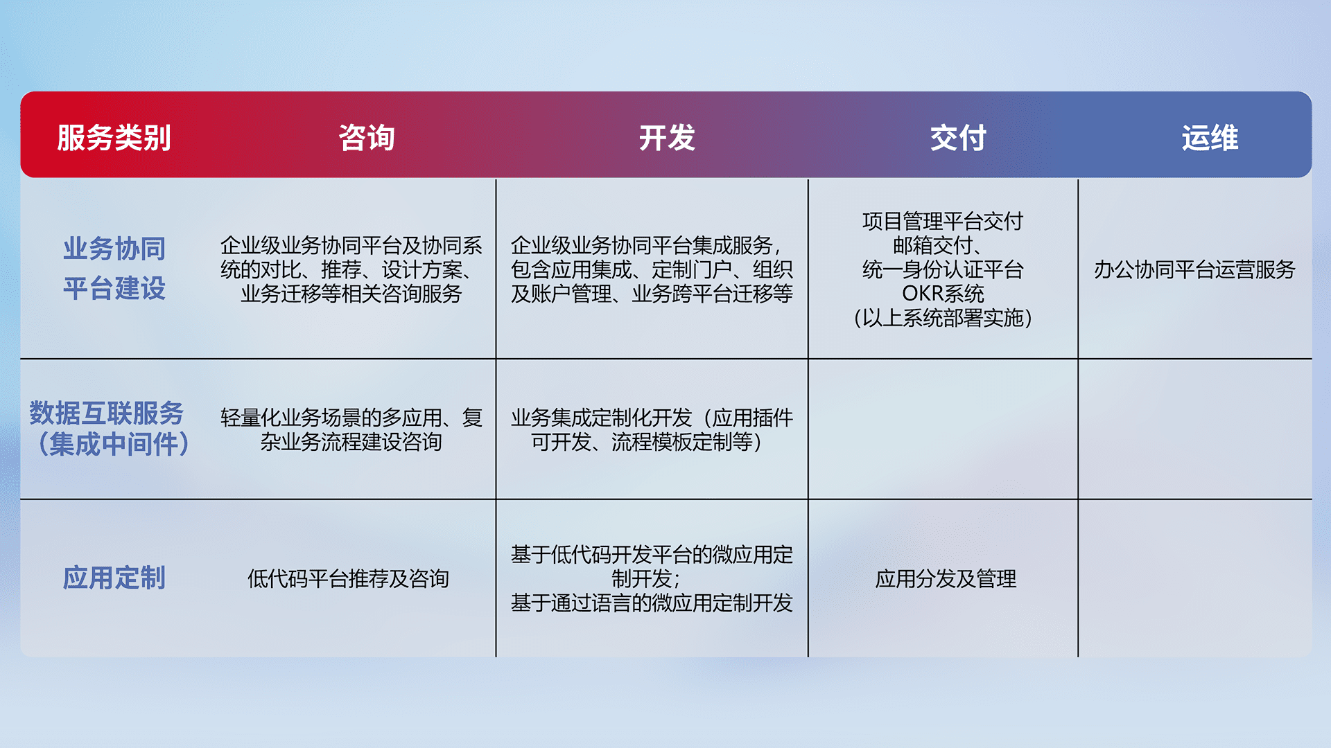 针对钉钉、、企微、、、IDaas等平台级产品提供产品的规划、、、、方案、、交付、、定制化开发等服务,,,实现如统一协同办公、、智能客户服务、、、混合会议管理、、智能数据查询、、等业务场景,,,实现数字化转型。。。