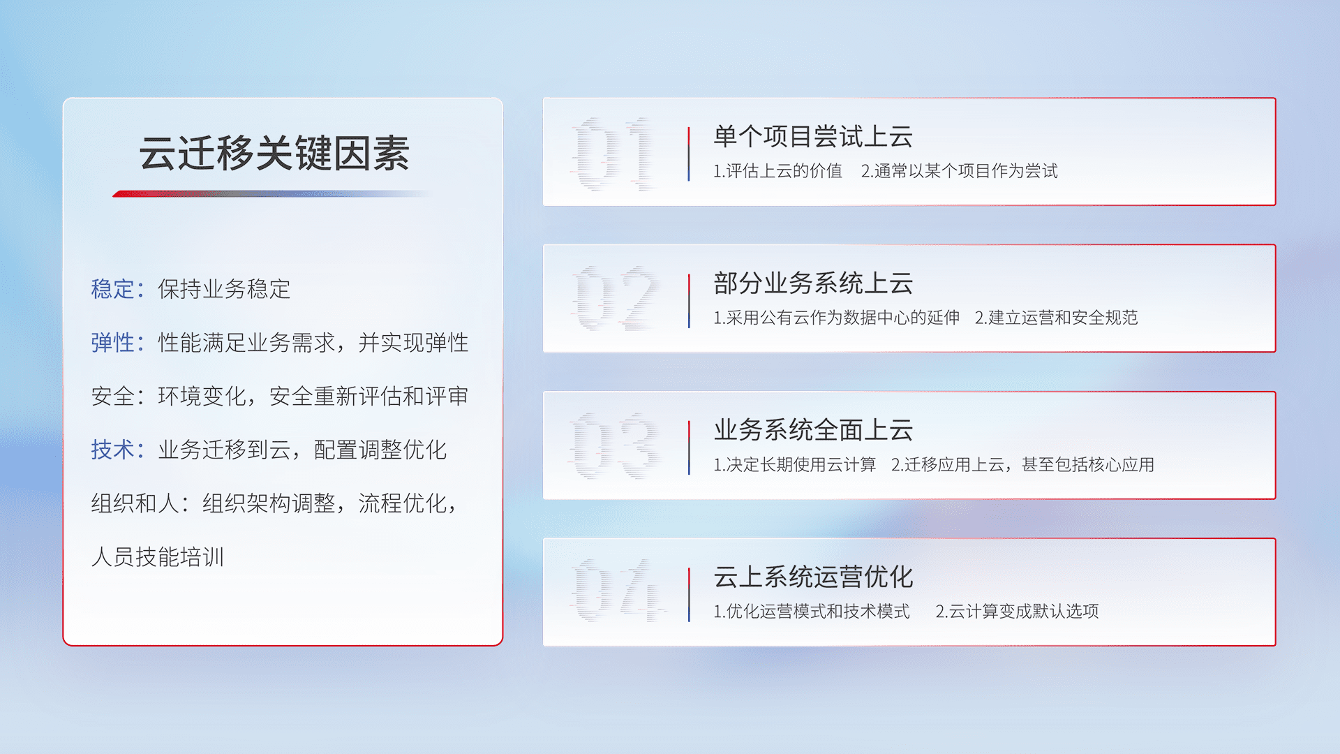 结合实际业务,,,,从规划设计、、、、云平台选型、、、、云原生改造、、数据迁移、、集成交付,,,迁移全过程为客户识别最佳上云路径,,,做好风险识别管理,,,,设计网络架构、、、身份权限、、、、安全审计合规、、、、操作审计、、、、日志审计、、、监控告警策略、、、多站点容灾设计等,,对云上基础设施进行整体规划,,提升IT治理水平,,,,以满足弹性、、、、高可用、、高性能的需求。。。。